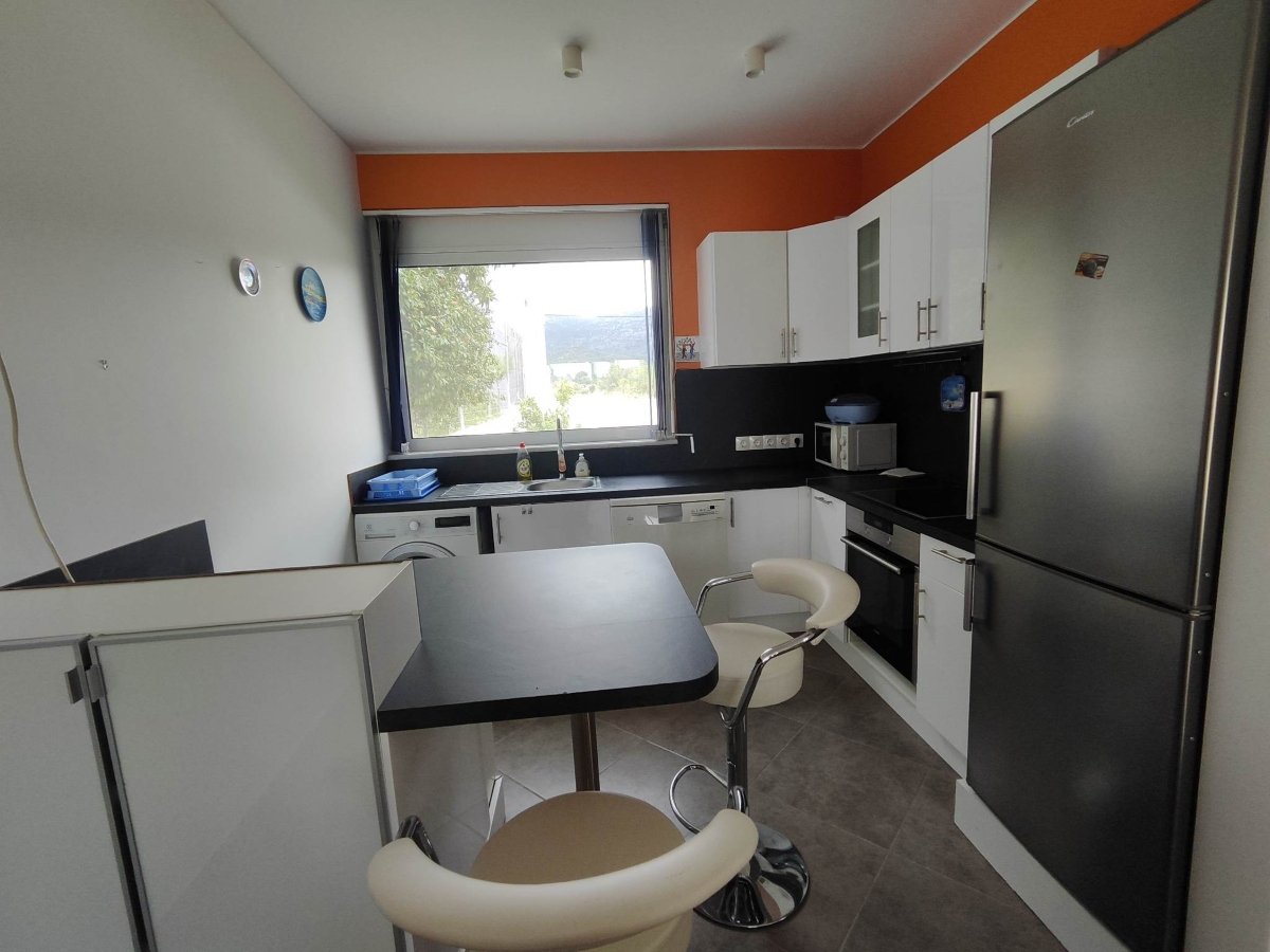 Au rez-de-chaussée, vous découvrirez un grand séjour chaleureux, ouvert sur l’extérieur grâce à de larges baies vitrées qui laissent entrer la lumière naturelle tout au long de la journée. La cuisine entièrement équipée (électroménager moderne, rangements optimisés, vaisselle et ustensiles inclus) est idéale pour les passionnés de cuisine. Ce niveau comprend également une première chambre confortable, une salle de bain avec douche et WC, ainsi qu’une buanderie fonctionnelle avec lave-linge.